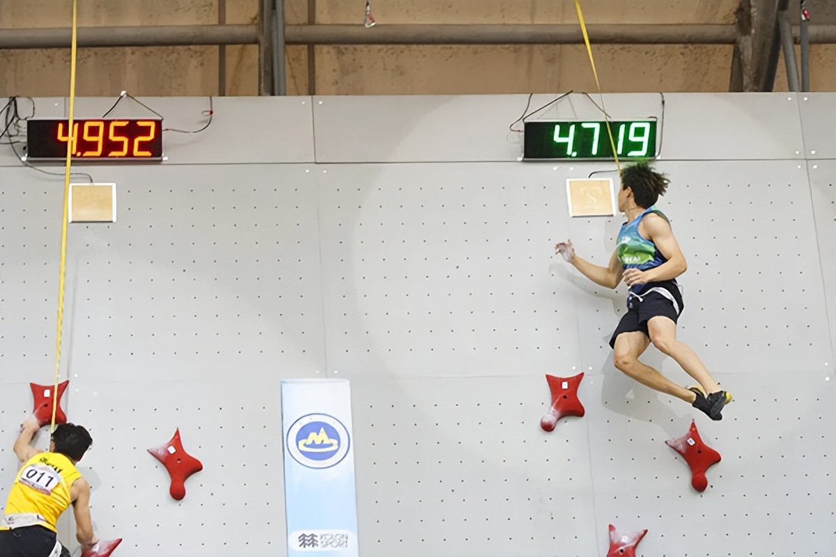 △赵一程(右)爬出了本次男子速度赛最好成绩:4.719秒